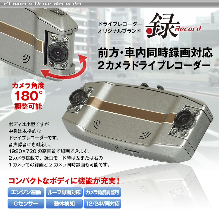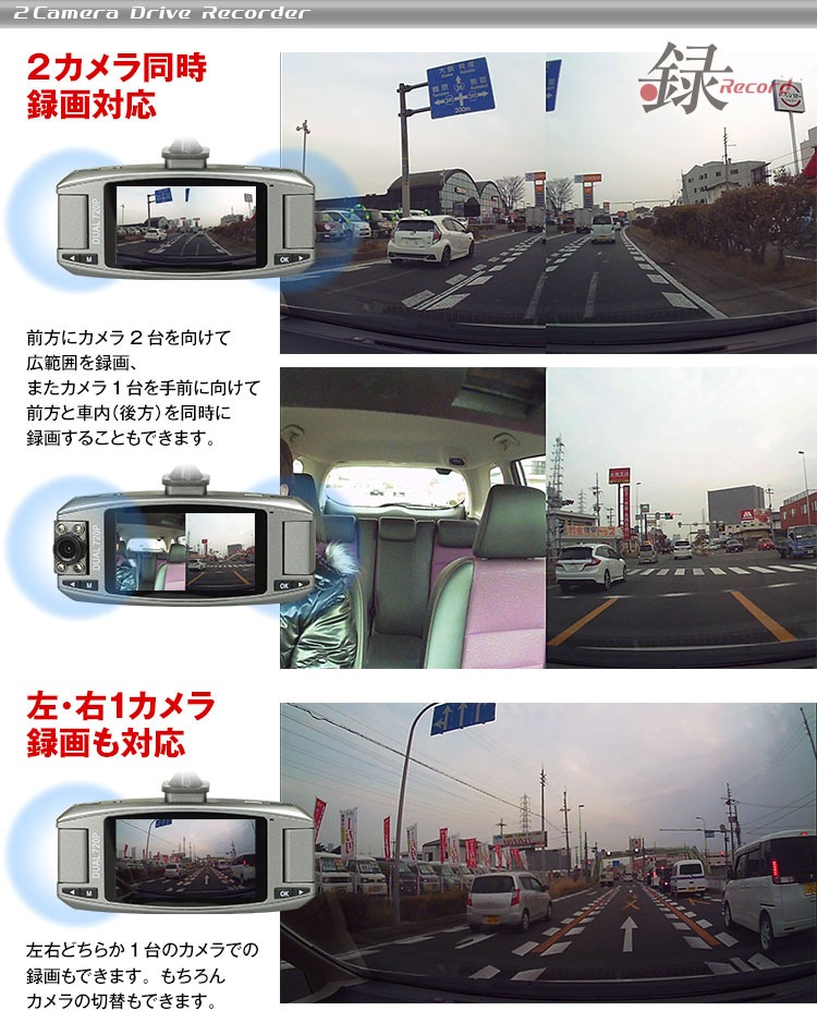 ご購入前の注意事項、当社製品サポートについて2カメラ搭載で前方/車内を同時録画可能 ボディは小型ですが中身は本格的なドライブレコーダーです。