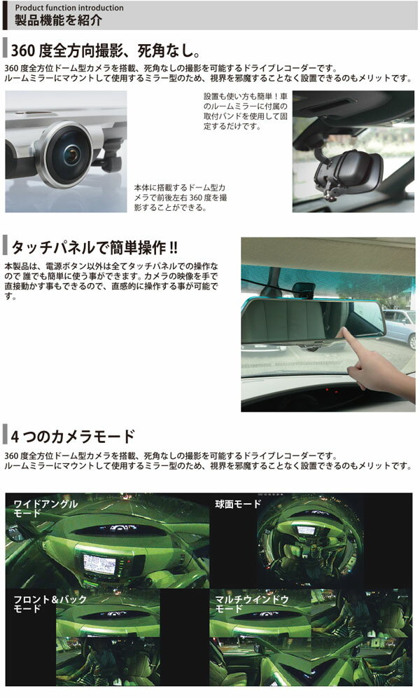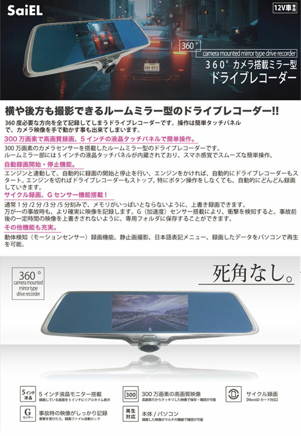 SaiEL 360°カメラ搭載 ミラー型 ドライブレコーダー SLI-ALV360※メーカー保証あり(6ヵ月)。