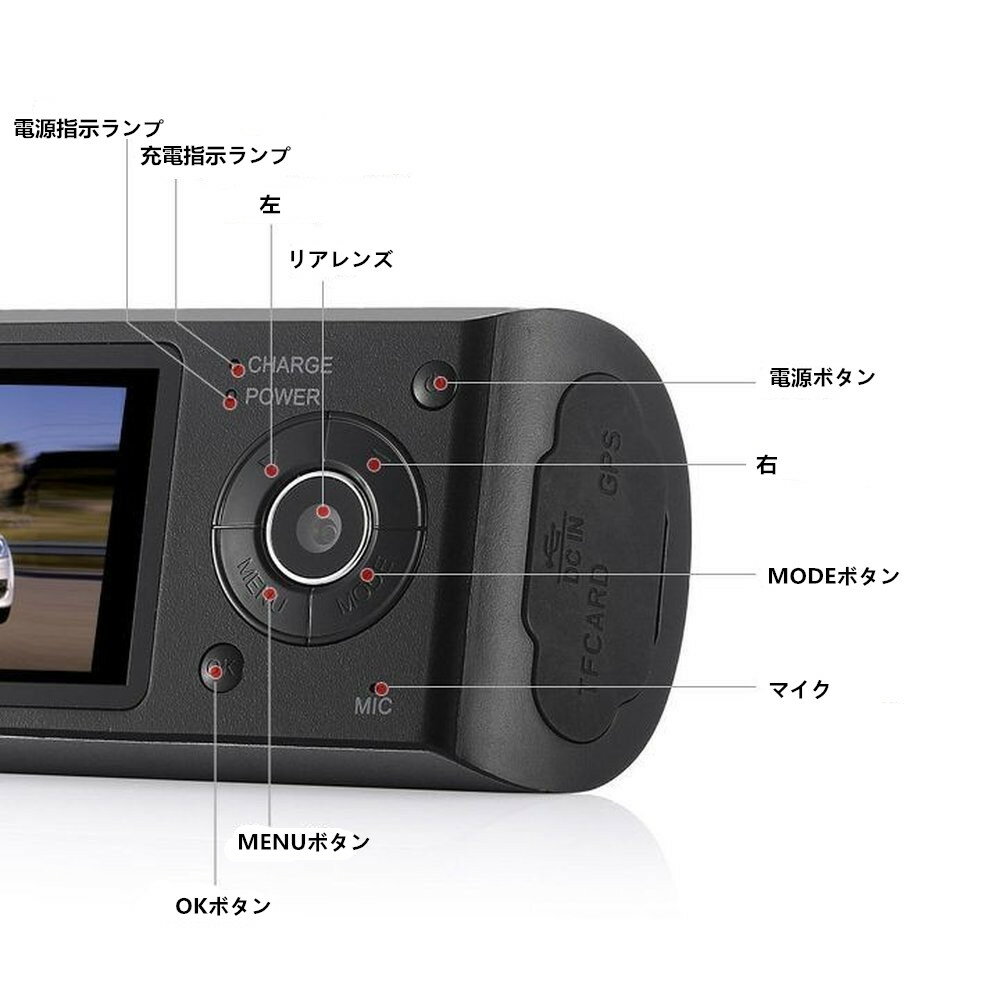 仕様 液晶モニター:2.7 インチ高清モニター(16:9) レンズ:超広角140度フロントレンズ1280*480、広角120度レアレンズ640*480 言語:日本語/英語/中国語/ロシア語/ドイツ語 録画ファイルフォーマット:AVI 記録メディア:Micro TFカード(4GB以上〜32GB・Class6以上) マイク/スピーカー:内蔵 電源DC出力:5V 電池:内蔵リチウムイオン電池 OS:Windows2000/XP/Vista/Windows7 ご注意:本製品の仕様、画面表示、外観は、改良のため予告なく変更する場合がございます。